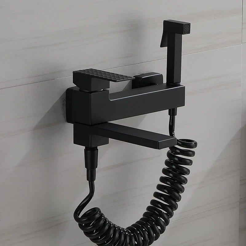 The EleganceLuxFlow shower mixer tap in brushed gold combines sophistication and functionality in one sleek set. The modern design, including wall mounting and matte black finish, adds a luxurious touch to your bathroom. With the integrated hand shower and bidet set, this tap is versatile and offers an elegant solution for daily use. The tap is easy to operate and ideal for a comfortable and stylish bathroom experience.