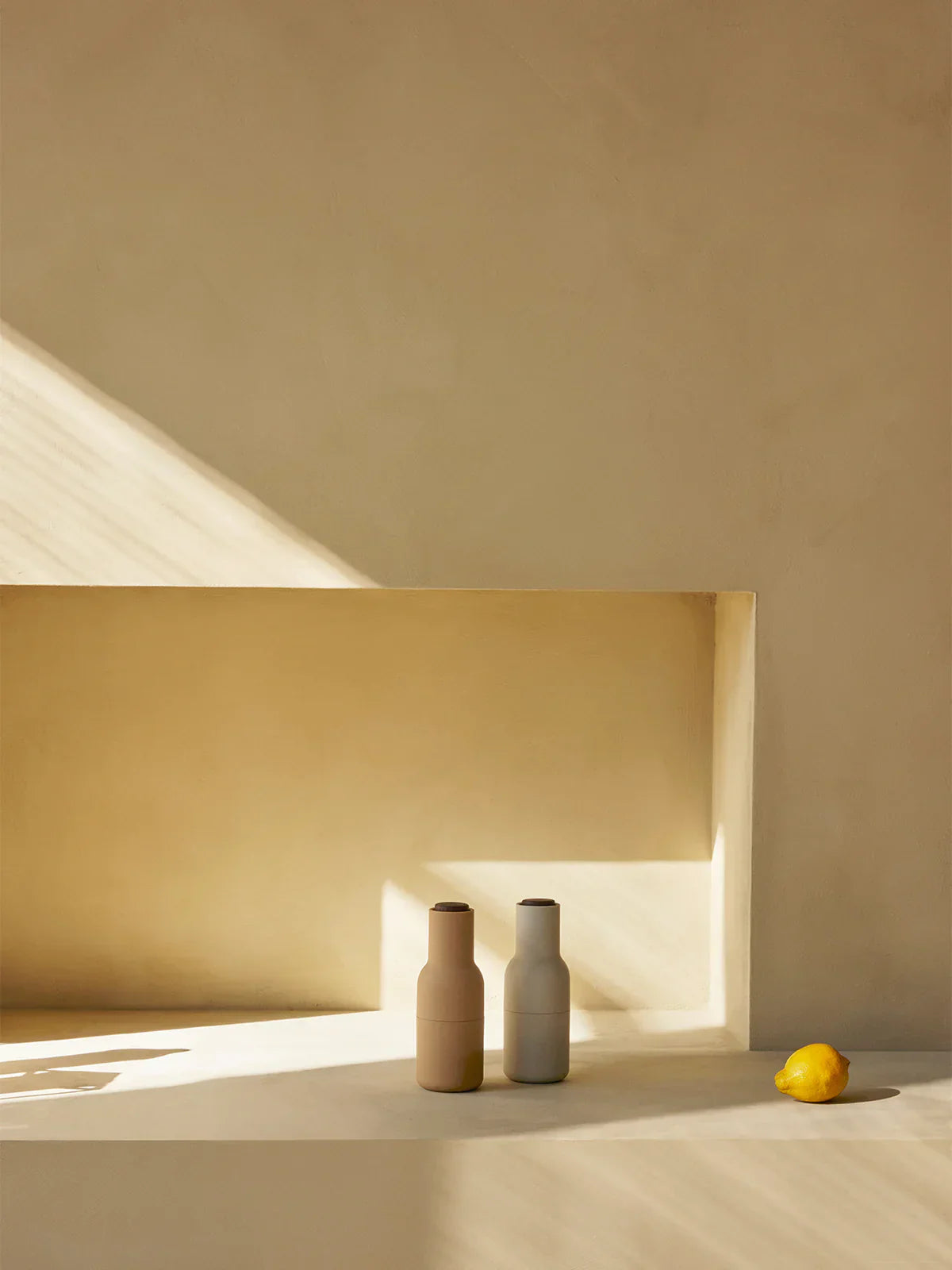 Discover the perfect combination of functionality and design with the AudoGrind pepper mill set. This set consists of two pepper mills, each equipped with a powerful ceramic grinding mechanism that effortlessly grinds various spices. The bottle-shaped mills fit comfortably in the hand and are available in a range of sustainable materials and colors, including Barley, a warm and calming neutral shade that perfectly complements any kitchen design.